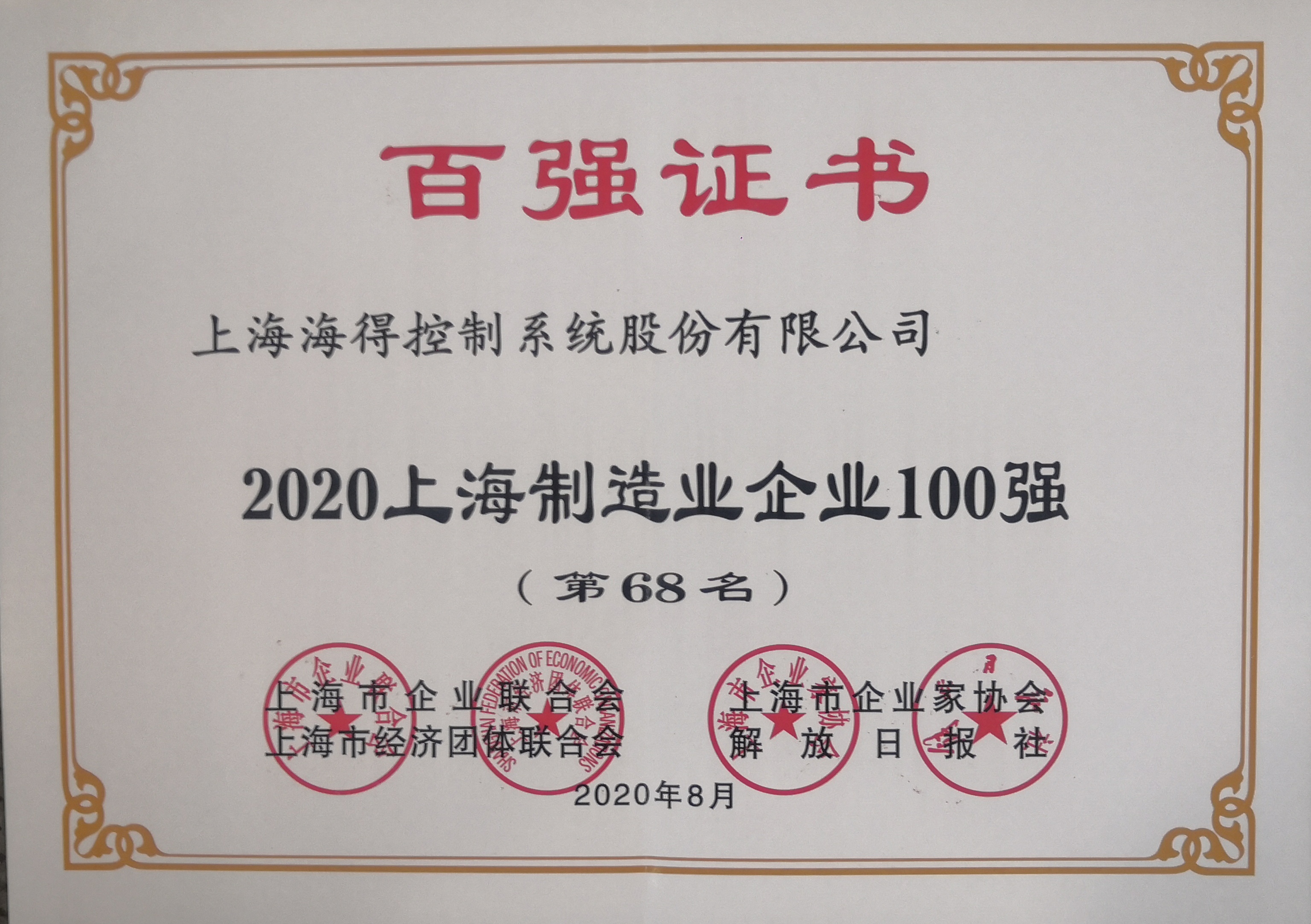 近(jìn)日(rì),上(shàng)海(hǎi)市(shì)企業(yè)聯合會(huì)、上(shàng)海(hǎi )市(shì)企業(yè)家(jiā)協會(huì)共同發布2020上(shàng)海(hǎi)民(mín)營企業(yè)100強排行(xíng)榜及2020上(shàng)海(hǎi↓)制(zhì)造業(yè)企業(yè)100強名單,海(hǎi)得(de)控制(zhì)入圍并排名上(shàng$)海(hǎi)制(zhì)造業(yè)企業(yè)百強第68位,民(mín)營制(zhì)造業(yè)企業(y×è)第43位。