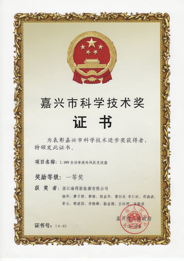 2.0MW全功率液冷(lěng)風(fēng)機(jī)變流器(qì)獲得(de)嘉興市(shì)科(kē)技(jì)進步獎一(yī)等獎