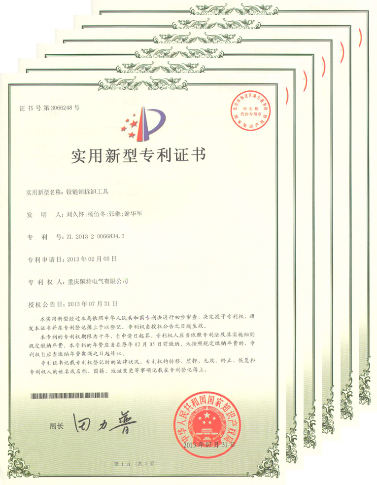 發布時(shí)間(jiān):2013-10-14重慶佩特電(diàn)氣有(yǒu)限公司近(jìn)日(rì)一(yī)次性獲得(de)6項由國(guó)家(jiā)知(zhī)識産權局頒發的(de)實用(yòng)新型專利證書(sαhū)。本次獲得(de)的(de)6項實用(yòng)新型專利具有(yǒu)覆蓋面廣,實用(yòng)性強的(de)特點。它們分(fēn)别為(wèi):《一(yī)種電(diàn)流測量電(diàn)路(lù)》(專利号:ZL2013 2 0066986.3)、《老(lǎo)化(huà)室溫度控制(zhì)電(diàn)路(♣lù)》(專利号:ZL 2013 2 0066990.X)、《手動液壓鉗定位工(gōng)裝》(專利号:ZL 2013 "2 0066853.6)、《用(yòng)于測試發熱(rè)型産品的(de)老(lǎo)化(huà)室》(專利号:ZL 2013 2 0066914.9)、《一(yī)種印刷工(gōng)♦裝》(專利号:ZL 2013 2 0066815.0)、《鉸鏈銷拆卸工(gōng)具》(專利号:ZL 2013 2 0Ω066834.3)。