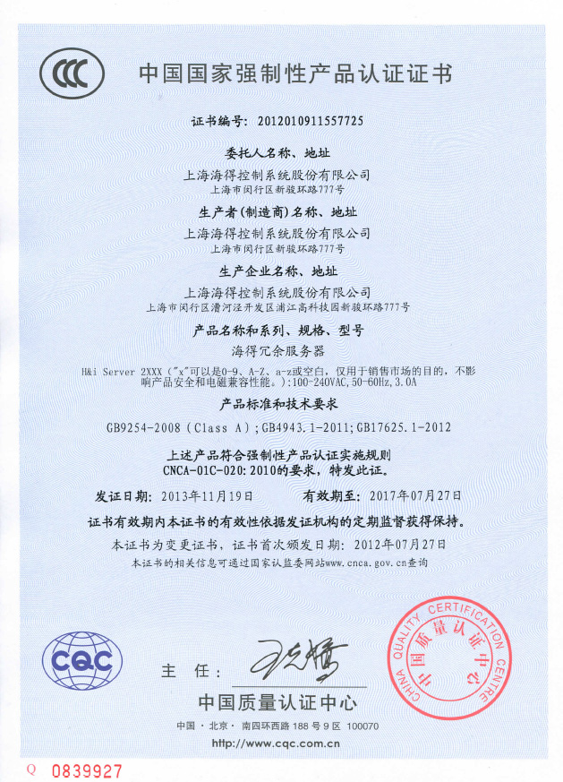 發布時(shí)間(jiān):2013-12-10近(jìn)日(rì),海(hǎi)得(de)控制(zhì)H&i Server冗餘服務器(qì)順利完β成3C認證證書(shū)标準換版工(gōng)作(zuò),并對(duì)安全換版、EMC标準換版、委托人(r≤én)地(dì)址變更等三方面內(nèi)容進行(xíng)了(le)變更,而且為(wèi)今後更大(dà)範圍的(de±)産品推廣打下(xià)了(le)堅實的(de)基礎。