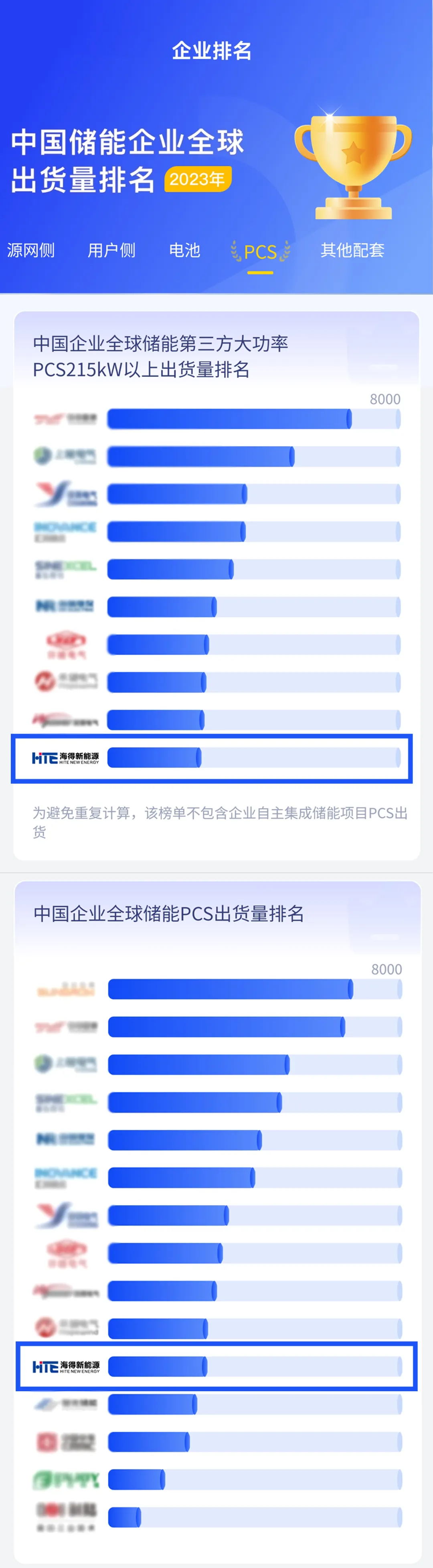 3月(yuè)29日(rì),在第六屆儲能(néng)嘉年(nián)華盛典暨2023年(nián)度中國(λguó)儲能(néng)企業(yè)全球出貨量排名發布會(huì)上(shàng),儲能(néng)領跑者聯盟(以下(xià)簡稱EESA)權威發布“2023年(nián)度儲能(néng)産業(yè)上(shàng)下(xià)遊環節及細分(fēn)賽道('dào)企業(yè)排名”,海(hǎi)得(de)新能(néng)源榮登中國(guó)企業(yè)全球儲♥能(néng)第三方大(dà)功率PCS215kW以上(shàng)出貨量TOP10,及中國(guó)企業(yè)全球儲能(néng)PCS出貨量TOP11,成功跻身(shēn)儲能(néng)PCS市(shì)ε場(chǎng)前列,并榮獲“中國(guó)新型儲能(néng)百大(dà)品牌”稱号!