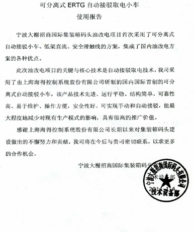 2.2010年(nián)8月(yuè),在與青島港簽訂合同的(de)同時(shí),甯波招商國(guó)際集裝箱碼頭公司也(yě)ε與上(shàng)海(hǎi)海(hǎi)得(de)公司簽訂了(le)取電(diàn)裝置的(de)購(gòu)買合同,共100台套,合同金(jīn)額達800萬元,并已經σ大(dà)批量交付使用(yòng),使用(yòng)效果極佳,得(de)到(dào)該用(yòng)戶的(de)高(gāo)度評價和(hé)認可(kě)。