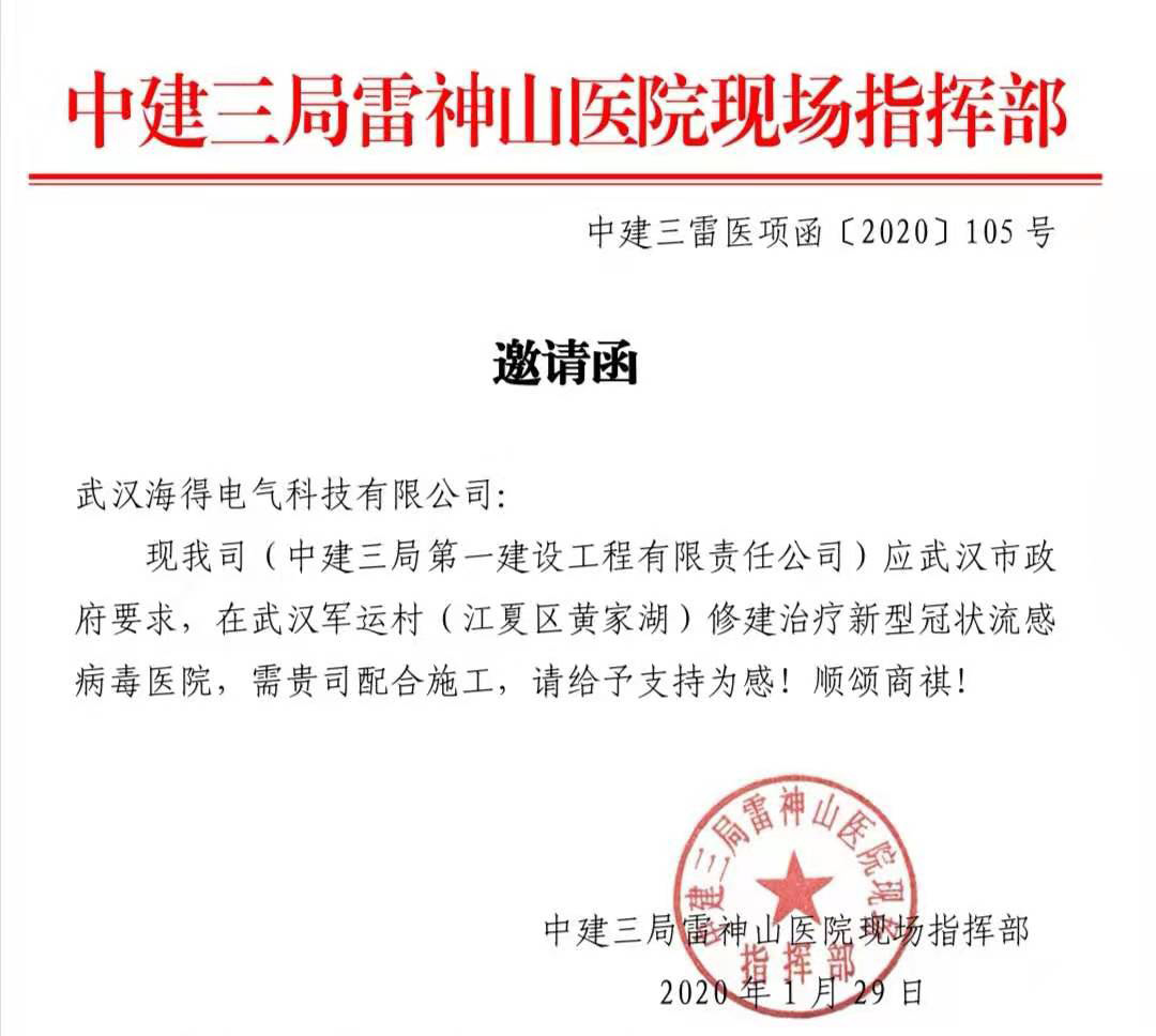 發布時(shí)間(jiān):2020-02-05這(zhè)場(chǎng)突如(rú)其來(lái)的(de)疫情,打亂了(le)新年(nián)歡樂(yuè)的(de)氛圍,武漢新型冠狀病毒肺炎疫情牽動著(zhe)全國(guó)人(rén)民(mín)的(de)心。1.23日(rì)武漢封城(chéng),封城(chéng)當天,武漢新型肺炎防控指揮部決定,參照(zhào)北(běi)京小(xiǎo )湯山(shān)的(de)模式,新建火(huǒ)神山(shān)醫(yī)院和(hé)雷神山(shān)專門(mén)醫(yī)院。并分(fēn)别于1月(yuè)23日(rì)晚火(huǒ)神山(shān)醫(yī)院開(kāi)工(gōng),1月(yuè)25日(rì)下(xià)午雷神山(shān)醫(yī)院開(kāi)工(gōng)。武漢海(hǎi)得ε(de)電(diàn)氣科(kē)技(jì)有(yǒu)限公司作(zuò)為(wèi)武漢當地(dì)最大(dà)的(de§)電(diàn)氣分(fēn)銷服務商,應此次承擔專門(mén)醫(yī)院建設的(de)中建三局雷神山(shān)現(xiàn)場(chǎng)建設指揮部請(qǐng)求,第一(yī)時(shí)間(jiān)即全力投入到(dào)武漢抗擊新型冠狀病毒的(de)戰役中。