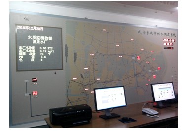 ● 調度中心配置了(le)一(yī)面5000mm*2200mm的(de)馬賽克大(dà)屏幕顯示系統,把整個(gè)鹹甯地(dì)區(qū)配水(shuǐ)管網的(de)地(dì)圖詳細地(dì)繪制(zhì)在上(shàng)↓面,并在相(xiàng)應的(de)監測點顯示當前設備的(de)運行(xíng)狀況及管網壓力等關鍵參數(shù),非常直觀、方便的(de)監控到(dào)管網供水(shuǐ)的(d'e)運行(xíng)工(gōng)況,便于實現(xiàn)供水(shuǐ)的(de)調度;