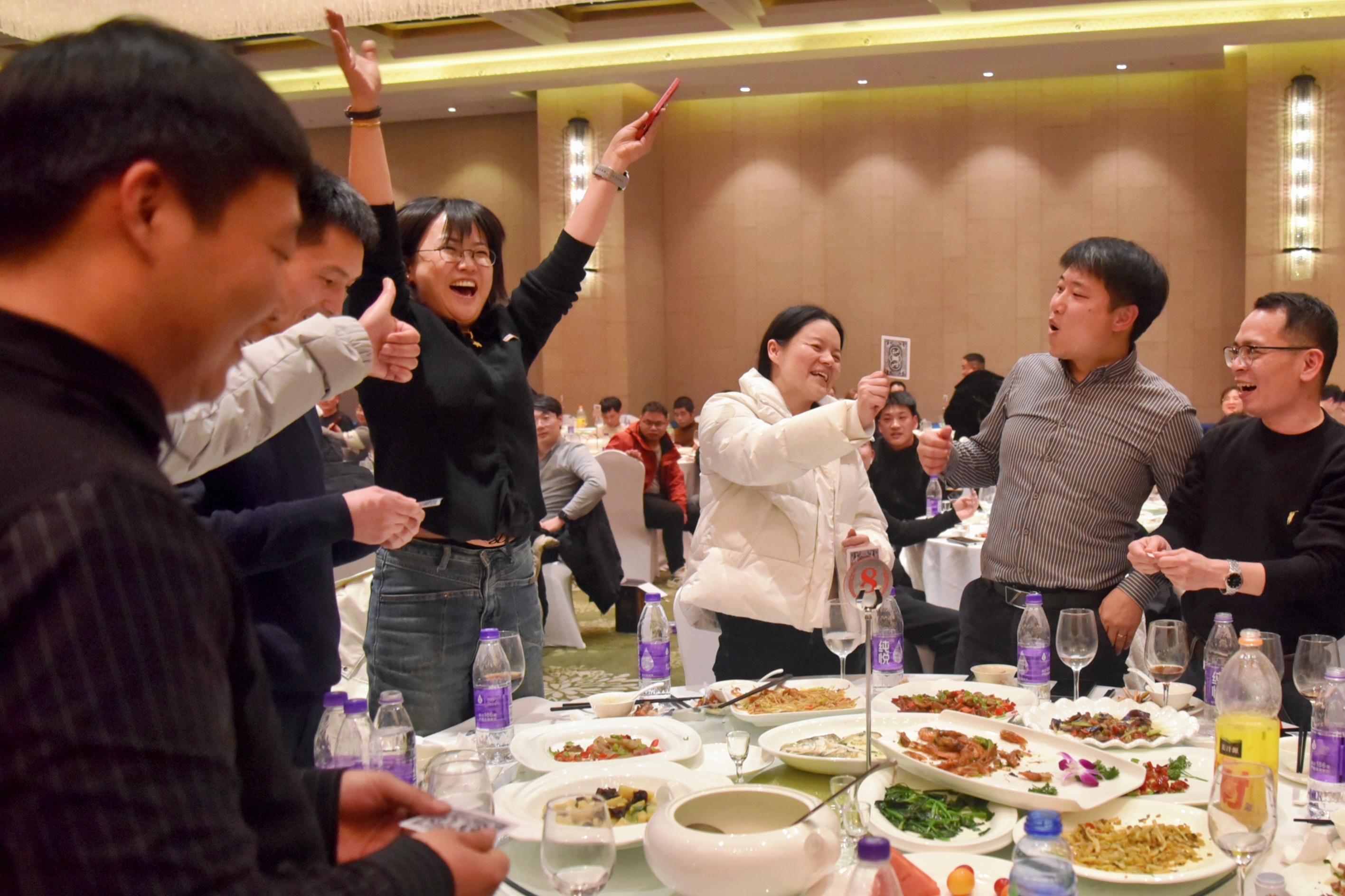 晚宴進行(xíng)的(de)同時(shí),公司通(tōng)過“線上(shàng)搶紅(hóng)包”的(de)方式普降海(hǎi)量紅(hóng)包雨(yǔ),還(hái)通(tōng)過“線下(xià)撲克牌抽獎“的(de)方式來(lái)抽Ω取8部中高(gāo)端手機(jī),讓大(dà)家(jiā)感受新年(nián)喜慶的(de)同時(shí),收獲滿滿的(de)開(kāi)年(nián)福氣。