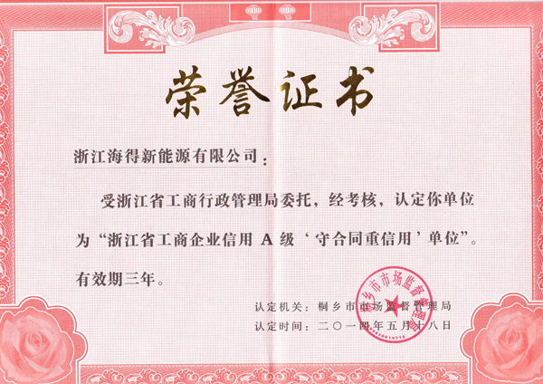海(hǎi)得(de)新能(néng)源榮獲浙江省A級守合同重信用(yòng)單位