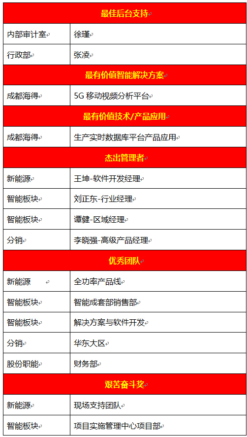之後,會(huì)議(yì)表彰了(le)各闆塊的(de)優秀團隊和(hé)優秀個(gè)人(rén),獎項及獲獎名單如(rú)下(xià):¥