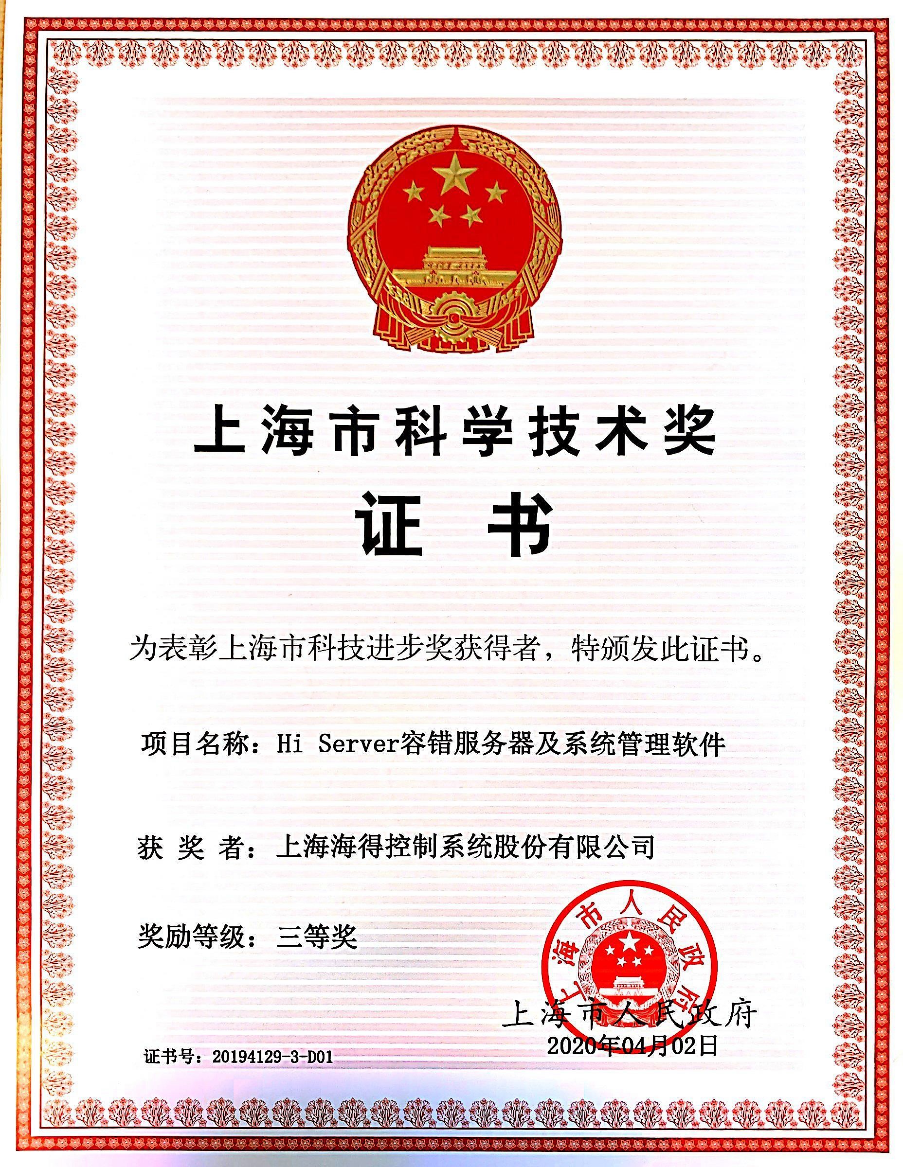 海(hǎi)得(de)控制(zhì)榮獲上(shàng)海(hǎi)市(shì)科(kē)技(jì)進步三等獎