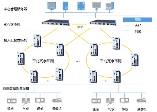 · 環形連接具有(yǒu)優異的(de)冗餘性,在100M的(de)連接下(xià)收斂時(shí)間(ji>ān)為(wèi)200ms,1000M的(de)連接下(xià)收斂時(shí)間(jiān)為(wèi)30ms,萬兆的(de)收斂時(shí)間(jiān)更短(duǎ€n)。