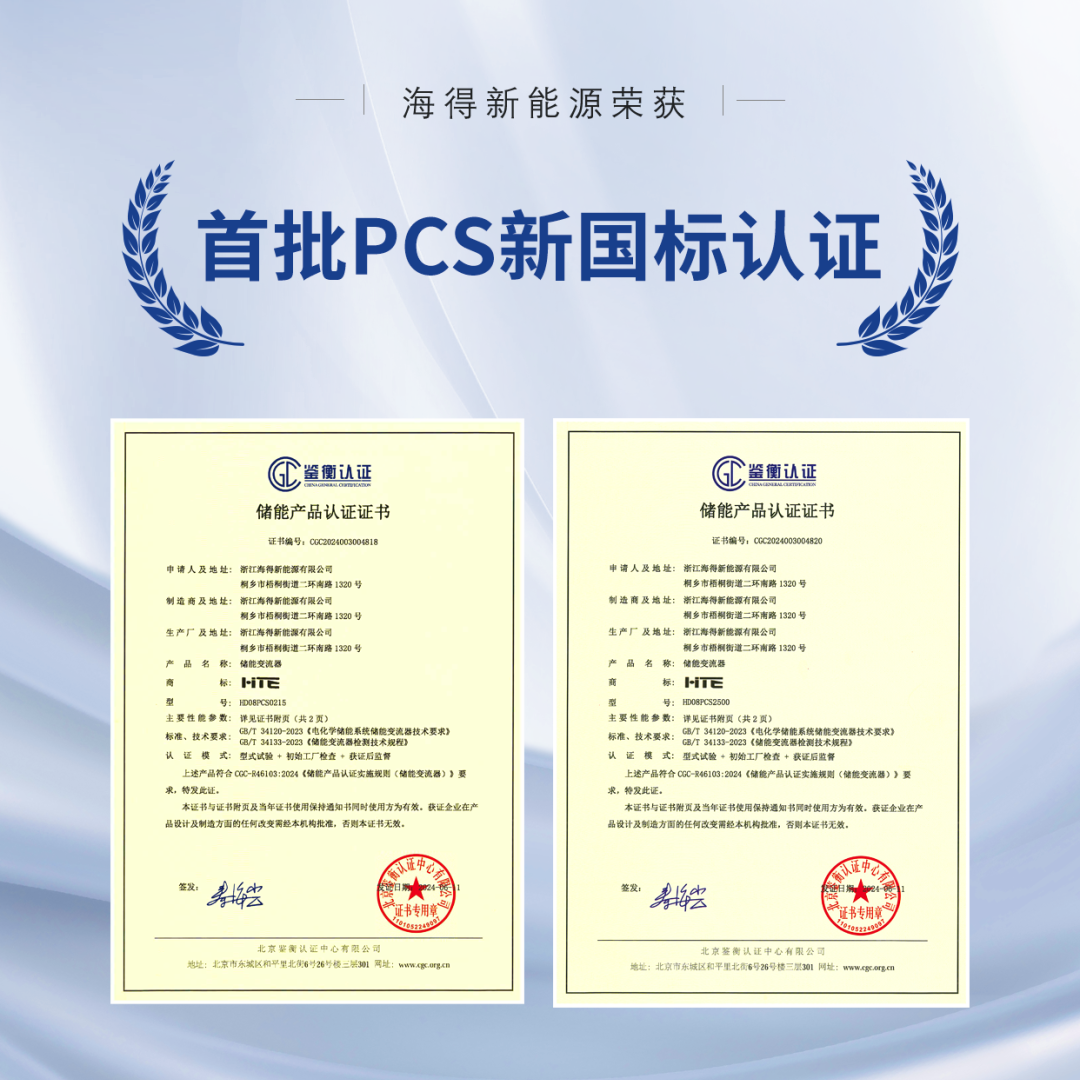 海(hǎi)得(de)新能(néng)源獲鑒衡首批新國(guó)标PCS認證證書(shū)